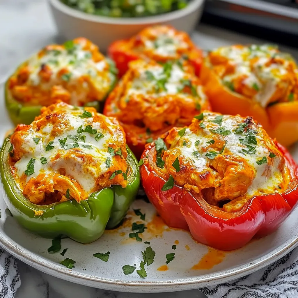 Buffalo Chicken Stuffed Peppers are a delightful spicy twist on comfort food, made with shredded chicken and creamy cheese, all stuffed inside roasted bell peppers.