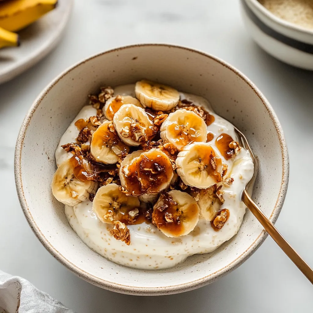 - Assemble the Bowl: Once the bananas are perfectly caramelized, spoon them over the yogurt. Don’t forget to drizzle any remaining caramel sauce from the skillet on top—trust me, it’s the best part!