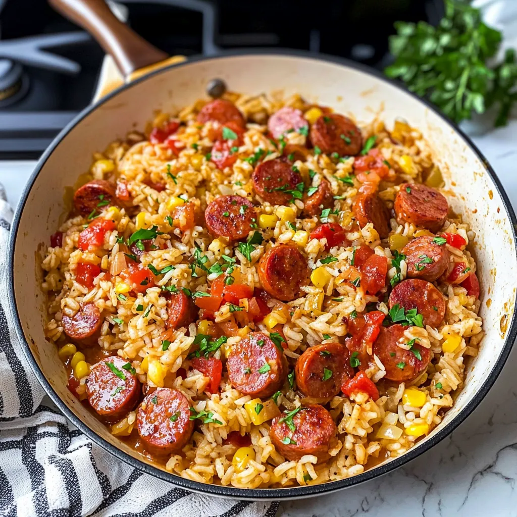 When it comes to serving up this cozy Kielbasa and Rice Skillet, I like to pile it high right from the skillet onto the plates. Perhaps add a hunk of crusty bread for that perfect bread-to-skillet ratio, so you can soak up every last bit of flavor! A light side salad with a tangy vinaigrette would contrast wonderfully against the heartiness of the dish, or maybe a steaming cup of soup if you’re feeling extra cozy. And if you want to elevate your meal, a glass of chilled white wine pairs beautifully with this comfort food.