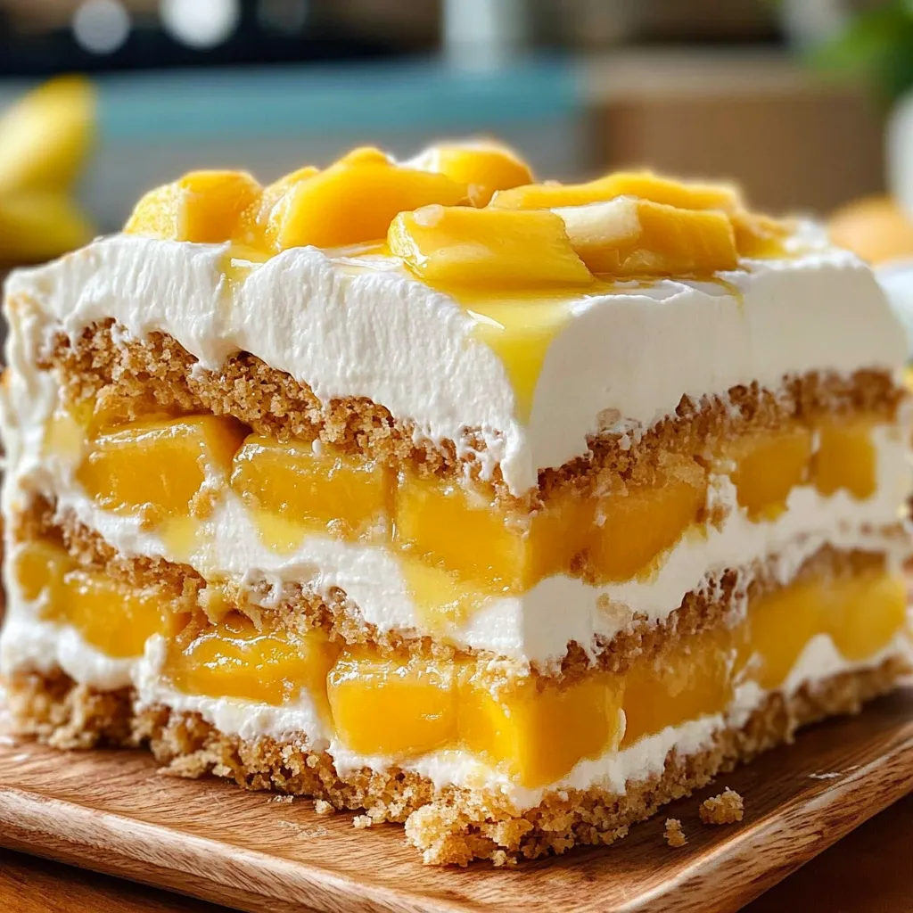 Layer a generous amount of mango slices over the graham crackers, ensuring even coverage for maximum sweetness in each bite. Repeat the layers (cream, graham crackers, mango) at least two more times, finishing with a layer of cream on top.