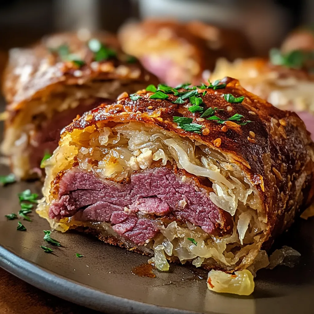 How about serving these Pastrami & Sauerkraut Rolls with a side of crispy potato chips or a simple arugula salad drizzled with lemon vinaigrette? The peppery greens will contrast nicely with the richness of the rolls. Feeling even cozier? Pairing it with a nice, hot cup of dill pickle juice or even a cold beer can elevate your experience further. You might find yourself relishing each bite as if it were a special occasion!