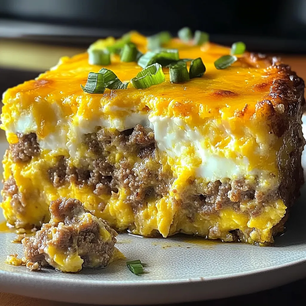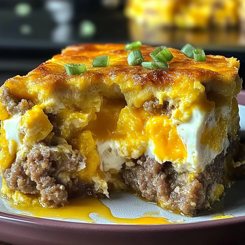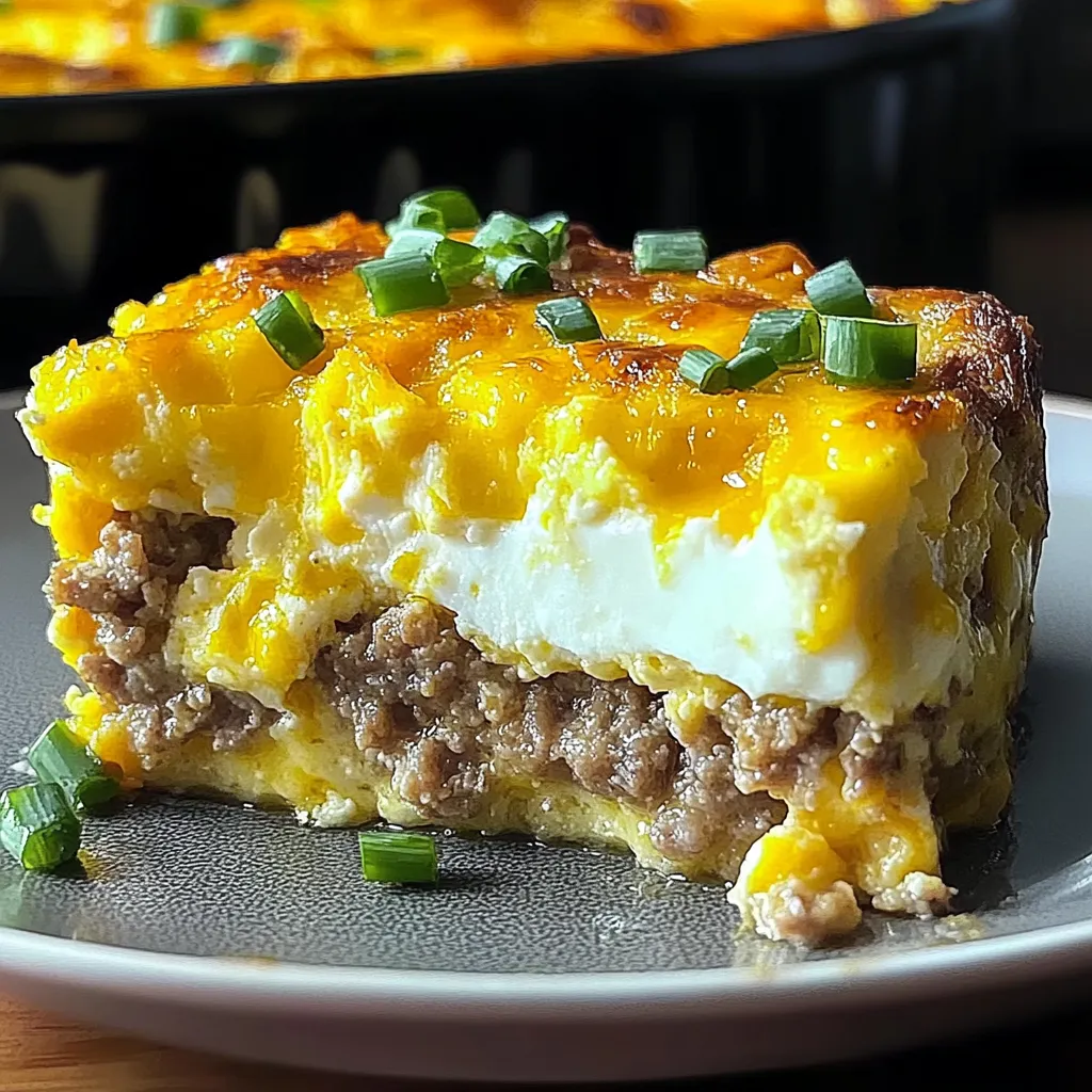 Indulge in a savory Sausage Egg Casserole with creamy cheese Perfect breakfast dish for a tasty morning meal Enjoy a delicious start