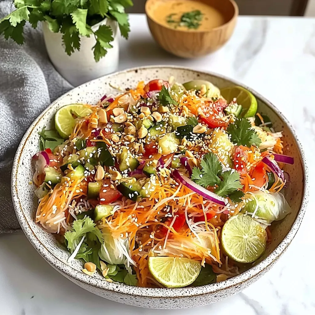 This Spring Roll Salad is fabulous on its own, but I love pairing it with a side of warm jasmine rice or a slice of crusty bread. It brings such a lovely balance to the meal. If you want to elevate the experience, serve it up with a chilled glass of iced green tea or a refreshing sparkling water with a slice of lime. Just imagine the colors on the plate – vibrant greens, bright oranges, and rich browns from the peanuts. It’s not just a meal; it’s a feast for the eyes!